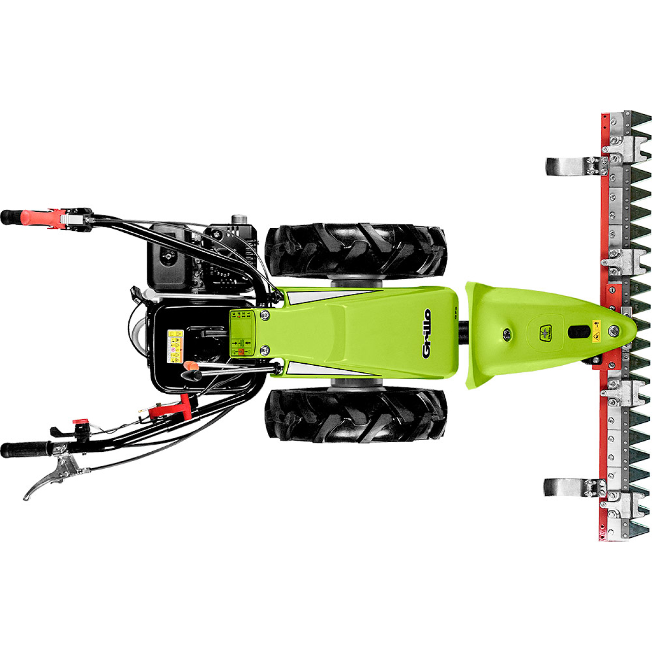 Das Differentialgetriebe erhöht die Manövrierfähigkeit und zusammen mit den Bremsen macht es den Grillo GF3 DF wendig auch bei Manövern an Hängen. Die zwei an den Rädern montierten Bremstrommeln werden durch zwei Hebel am Lenkholm gesteuert und erlauben so das alternative Abbremsen eines Rads und dann eines anderen. so dass der Wendekreis verbessert wird. Weiterhin sind die Hebel mit einer Sperrvorrichtung ausgerüstet. welche die Betriebsbremse auch in eine Feststellbremse umwandelt. die in der Lage ist. den Balkenmäher auch bei Arbeiten an Hängen festzuhalten. Die Differentialsperre wird durch einen „T“- förmigen Hebel am Lenkholm gesteuert und erweist sich als unentbehrlich um dem GF3 DF ein problemloses geradliniges Vorankommen zu gewährleisten. Das Schaltgetriebe mit 3 Vorwärts- und 3 Rückwärtsgängen des Grillo GF3 DF wurde entwickelt um die für das Mähen idealen Geschwindigkeiten zu gewinnen. 1.1. 2.6 und 4.3 km/h mit 4.00-8 „Tractor“ Rädern. Zum gleichmäßigen Mähen kann der Mähbalken frei geneigt werden und sich so allen Boden Unebenheiten anzupassen. Der Lenkholm ist auf vibrationsfesten Elementen aufgehängt. welche auch die seitlichen Vibrationen dämpfen. Der Lenkholm ist zur Anwendung an Hängen und in der Höhe seitlich verstellbar und kommt so auch den höchsten Ansprüchen nach. Weiterhin ist er reversibel und ist sinkbar. so dass die Ausmaße der Maschine erheblich verringert werden.