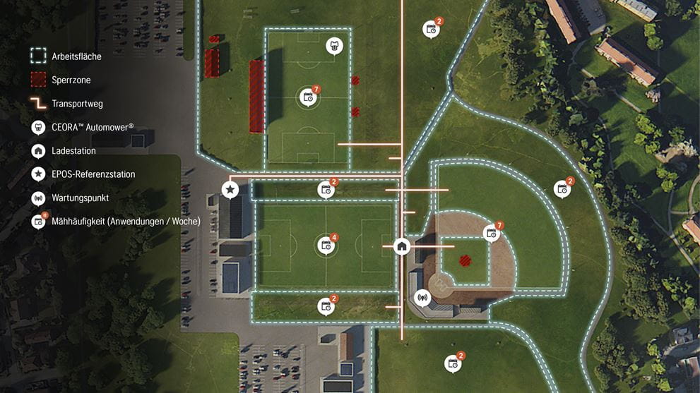 Das systematische Mähen paralleler Bahnen bedeutet, dass CEORA™ gleichermaßen effizient ist, egal ob es um die Pflege von Fußballplätzen oder anderer großer Grünflächen geht. Sie können auch Arbeitsbereiche definieren und einen Zeitplan festlegen, in dem verschiedene Zeiten und unterschiedliche Grashöhen zwischen 20 mm und 70 mm festgelegt werden. Planen Sie ein Spielfeld für den Schnitt am Morgen und ein anderes für den Schnitt mit einer anderen Schnitthöhe am Nachmittag ein. Durch das häufige, systematische und hochpräzise Mähen wird ein perfektes Ergebnis erreicht, da jedes Mal nur eine kleine Menge geschnitten wird.